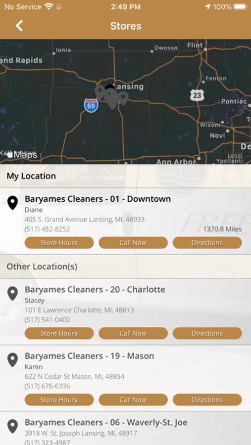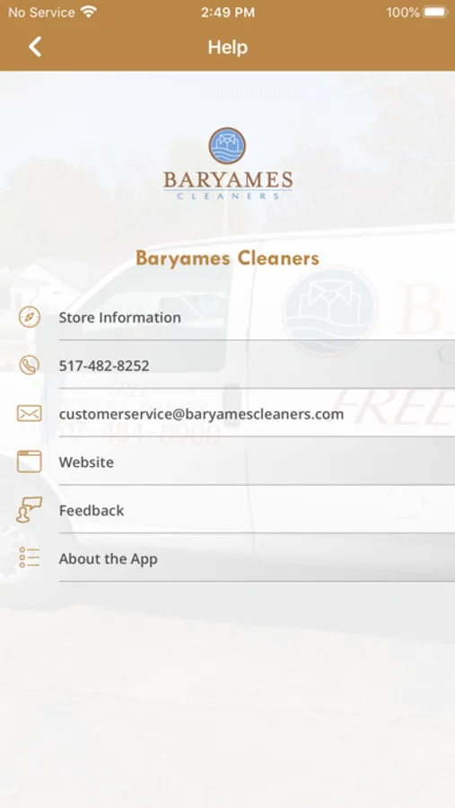 5) Quickly contact Baryames Cleaners by phone or email and access their website all directly from your device.