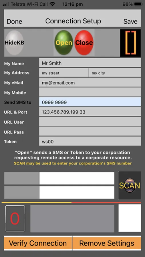 Using the QR reader updates the corporate SMS number on the setup page.
