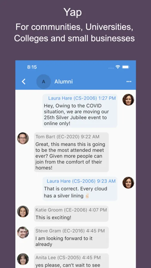 Yap is a app by and for the Alumni community of the Institute of Engineering and Technology, Lucknow, India. It has location, interest and profession based chat rooms where trusted and verified IETians can be a part of.