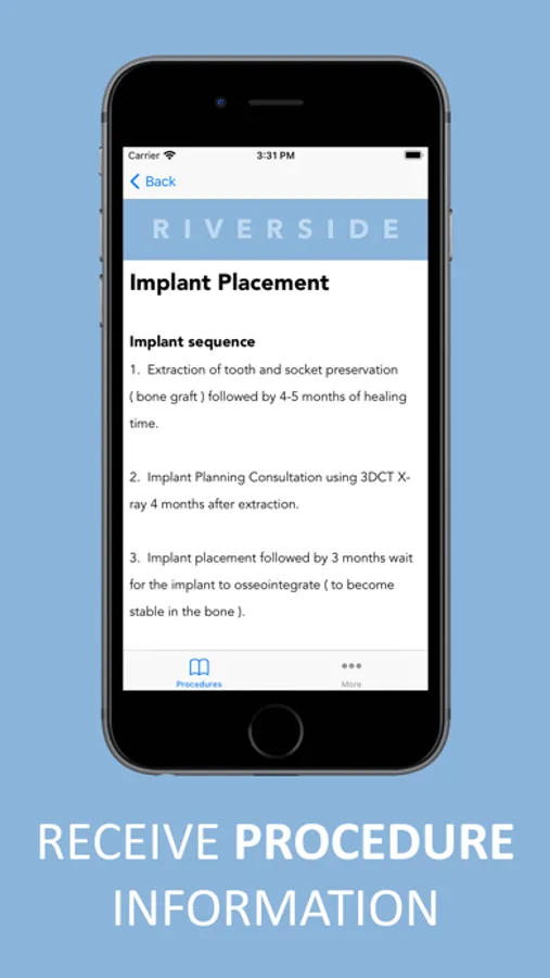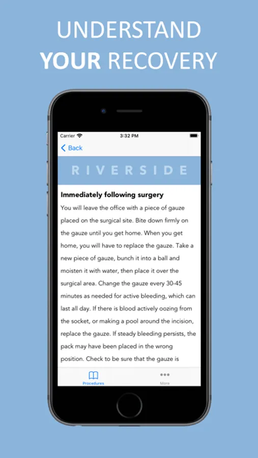 Be prepared for your surgery using the Riverside Oral Surgery app. You can find all the information you need to know about your surgery so that you can have a more timely recovery. You will also find important contact information in case you have any further questions.