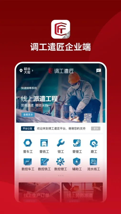 调工遣匠—可靠的灵活用工、生产订单及标准件采购平台,围绕互联网+工业平台运营、工业制造业、技工人才、企业发展的灵活用工需求,打造了线上订单版块、用工版块、商城版块、教育版块、劳务版块等多项细分产品,帮助生产企业解决现存问题,形成完整的服务闭环。