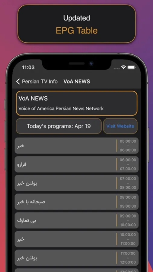 This app offers up-to-date 24-hour EPG service for Persian TV channels around the world!