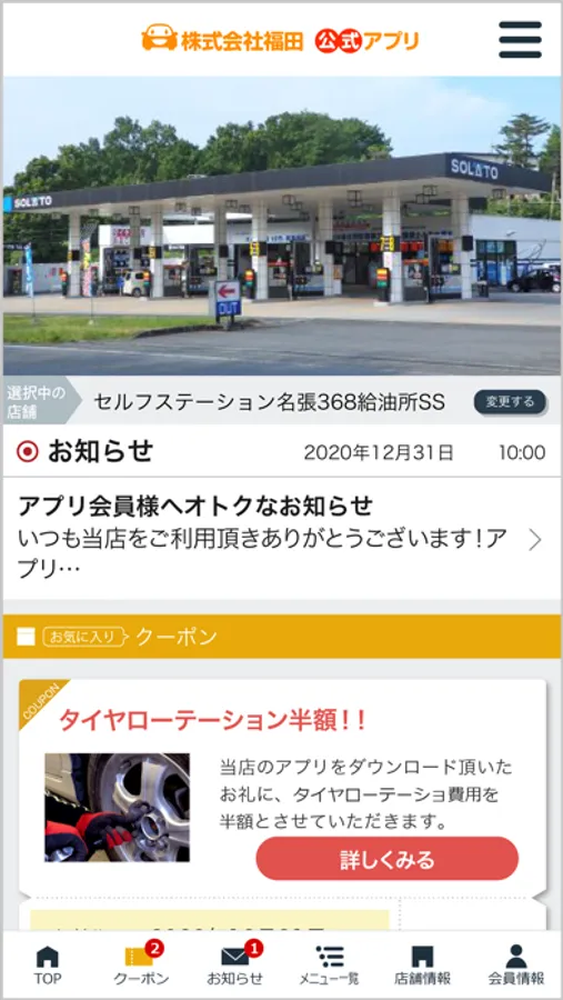 当社のアプリ「株式会社福田公式アプリ」はカーメンテナンスをするたびにスタンプが貯まり、決められたスタンプ数を貯めるとお得なプレゼントクーポンと引き換えができる、貯めて楽しいもらえて嬉しいお得なアプリです。その他、ご登録いただいた店舗で利用いただけるお得なクーポンや各種メニューの割引情報を配信しております。