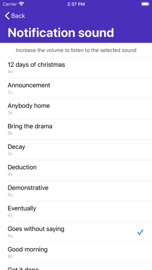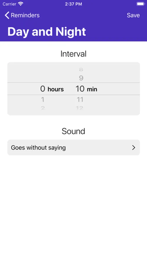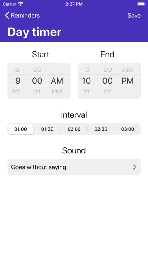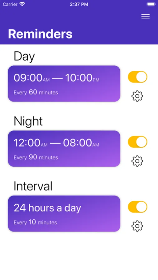 Turn on daily reminders to improve your mindfulness. You can set up three independent timers (day, night, interval). Each timer has individual settings: Start time, End time, Reminder interval, and Notification sound.