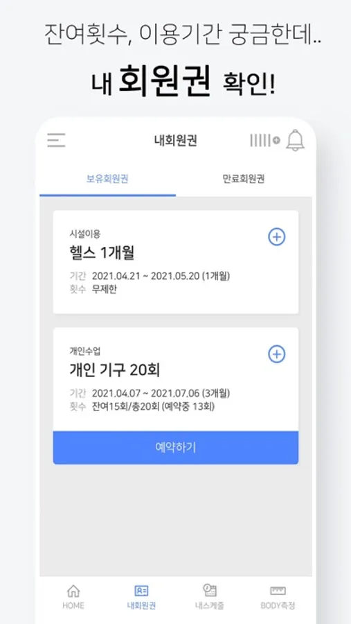 보유한 회원권의 잔여기간 및 횟수를 확인할 수 있습니다.