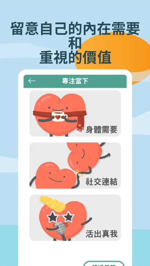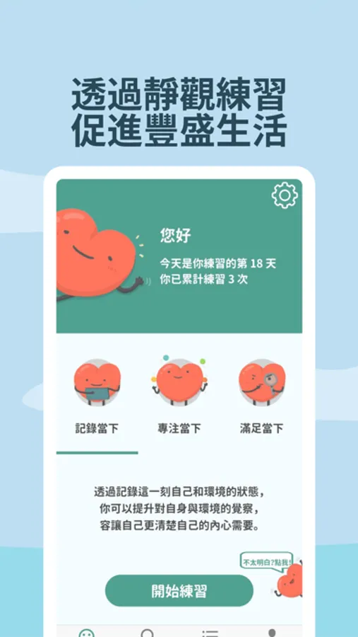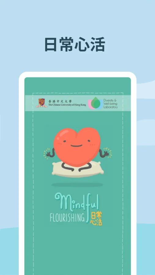 《日常心活》手機應用程式訓練透過電話應用程式進行,內容包括基礎靜觀練習、靜觀練習聲音導航、實時靜觀應用練習、以及其他心理健康資訊。用戶可自由於應用程式裏瀏覽資訊、完成練習以及進行評估。