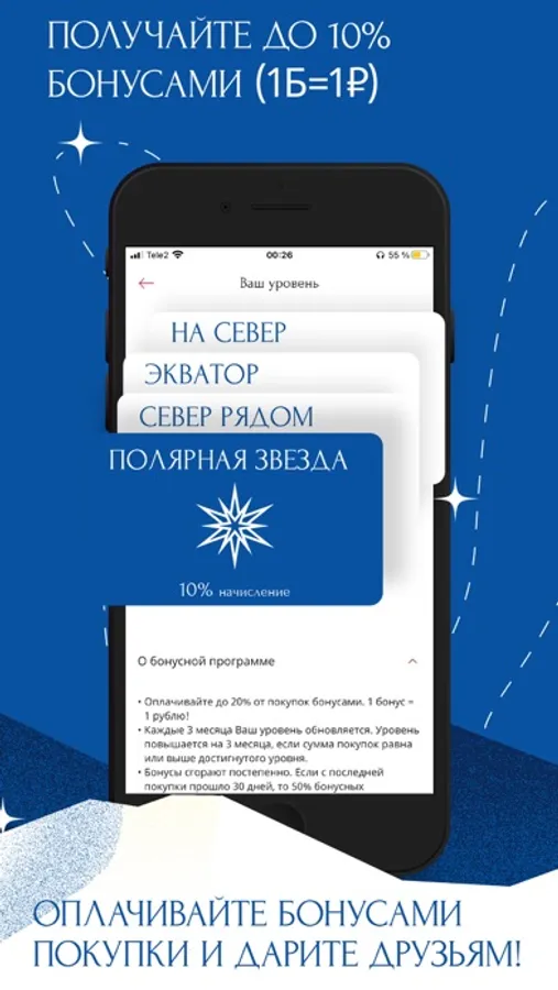 — Программа лояльности «Северный путь». Получите 50% бонусами после первого заказа и до 10% бонусами при последующих покупках. Больше покупок – больше бонусов! (1Б=1₽)
