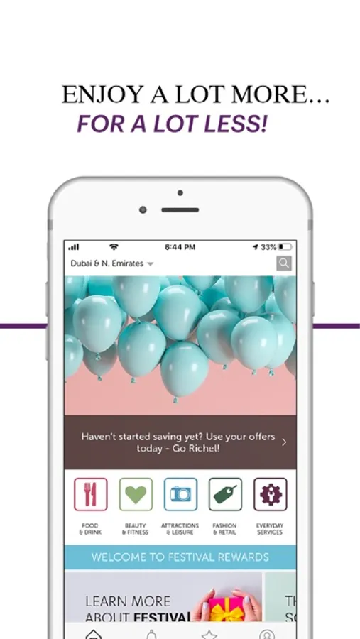 Festival Rewards is a lifestyle and loyalty app centered around enabling you to live your life to the fullest without restriction. We want you to be able to experience everything life has to offer without compromising. With Festival Rewards, you will gain free access to exclusive 2-for-1 offers and discounts at Dubai Festival Plaza and Festival City Mall.