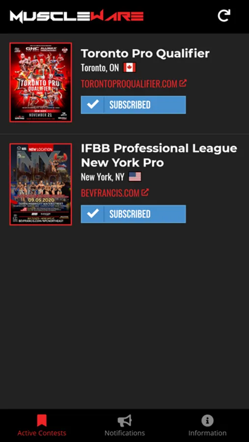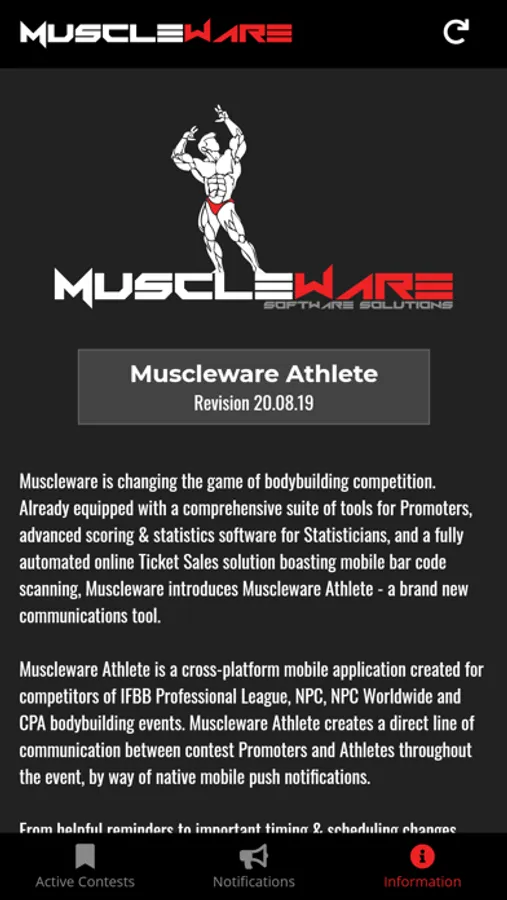 The Muscleware Live Notifications App is a communications tool used by Promoters of IFBB Professional League, National Physique Committee (NPC), NPC Worldwide and Canadian Physique Alliance (CPA) events.