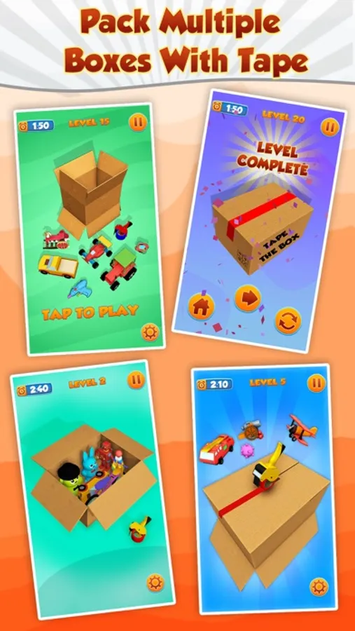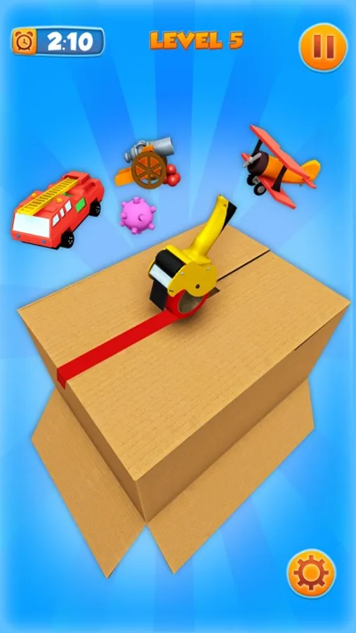 Entertaining and addicting yet relaxing game. Tap the box, have fun, push boxes behind or bump into them, in order to place tap on the boxes as fast as you can and throw boxes over the edge. Do not let boxes pile up. Do your best to keep up with speed and new boxes of different colors and sizes. As you progress you will get a new better and advanced platform with different variety of featured. You have to tape up all these boxes really quick! Use everything you can think of in this oddly satisfying 3d simulator!