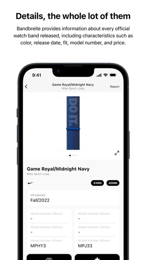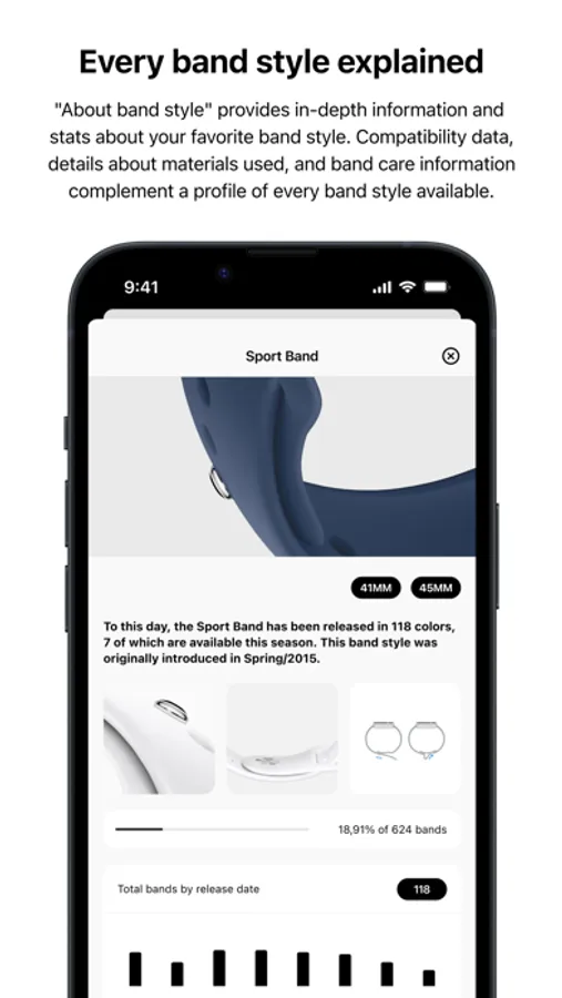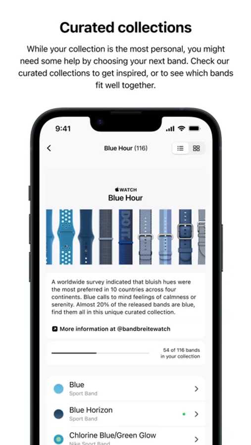 Bandbreite provides detailed information about every official watch band ever released, including characteristics such as color, release date, model number, and price. Options to create a wishlist and to track your collection —with unique stats and insights included— make this beautifully designed app the perfect companion for every watch band collector, beginner to pro.