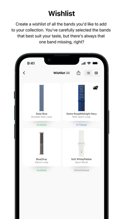 * Wishlist :: There‘s always that one band missing, right? Bands can be added to a wishlist, which gives you the best overview of what to look for next. Change the status of a band to "In transit" to keep track of upcoming additions.