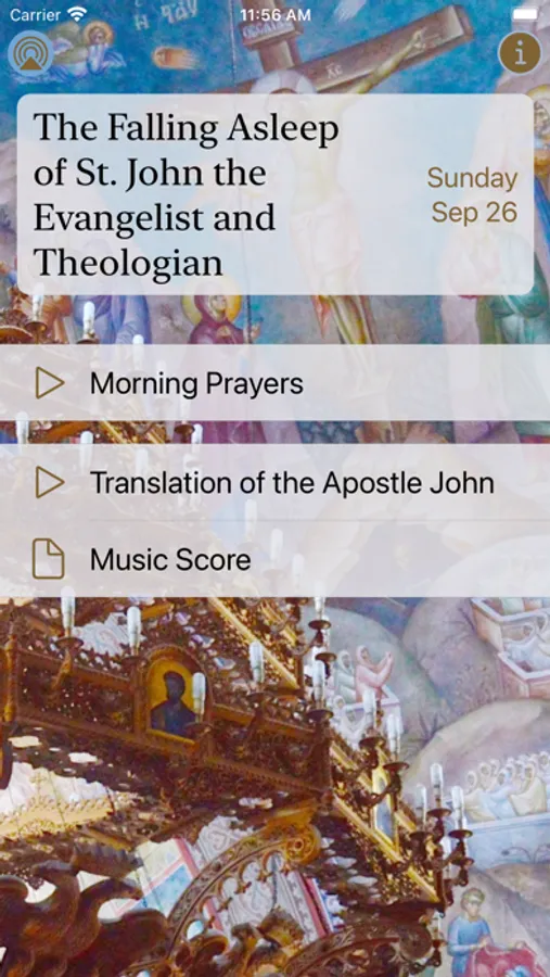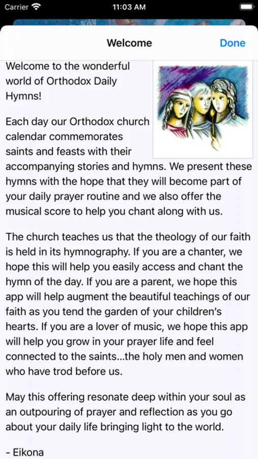 The Eikona app offers hymns for each day of the Liturgical year to enrich your daily prayer life. Listen to the hymn and, if desired, follow along with the beautifully illustrated sheet music. Also included are Morning Prayers and the 12 Festal Hymns throughout the Greek Orthodox calendar year.