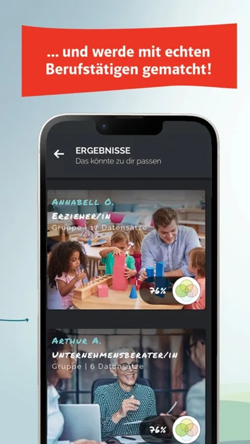 Bei der Berufsorientierung ist es wichtig, sich mit solchen Fragen auseinanderzusetzen. CIRCLES unterstützt dich durch das IKIGAI-Prinzip bei der Beantwortung dieser Fragen und dabei, deine individuellen Stärken, Ziele und Wertvorstellungen herauszufinden. Die App verbindet Selbst- und Fremdeinschätzung und inspiriert durch das Matching mit Profilen von echten Berufstätigen. Lade dir die App kostenfrei herunter und erfahre, welche Berufe am besten zu deinen Zukunftsvorstellungen und Stärken passen könnten.