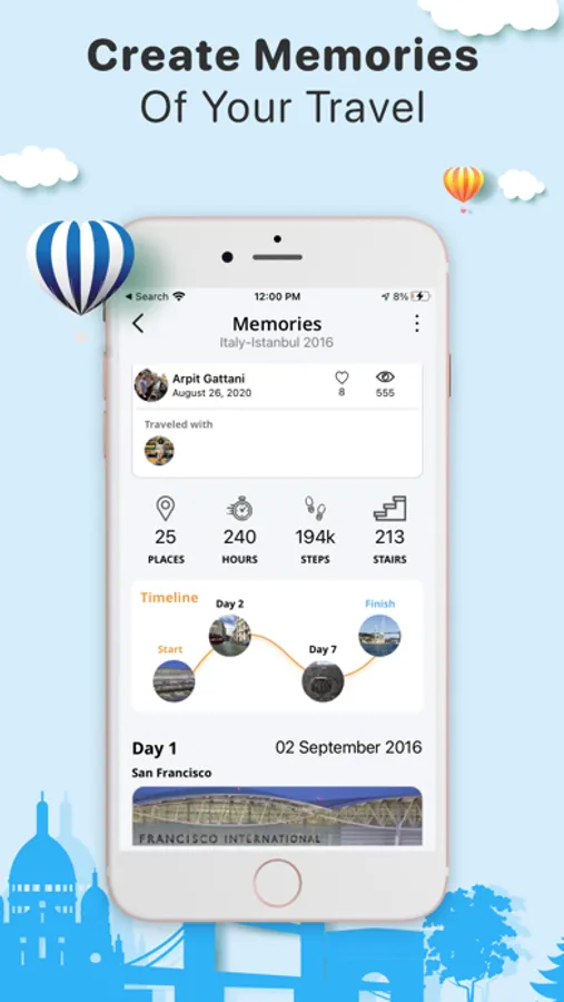 Once you start a new trip, Travelory will work in the background for you and log all your travel experiences. You can see the places you visited, the restaurants you dined in, the hotels you slept in and the time you spent doing all those activities. Travelory also shows you health stats for your trip including total steps you walked and stairs you climbed during your trip. Steps and stairs are fetched by integrating with the native HealthKit.