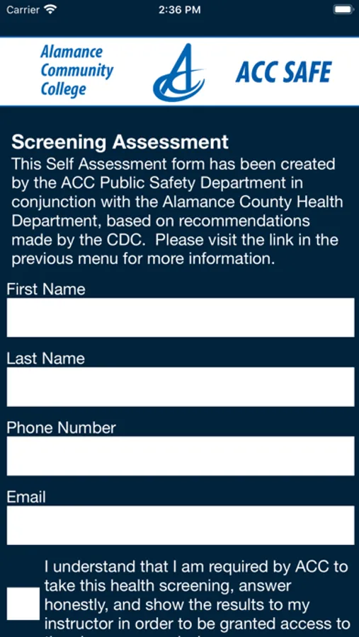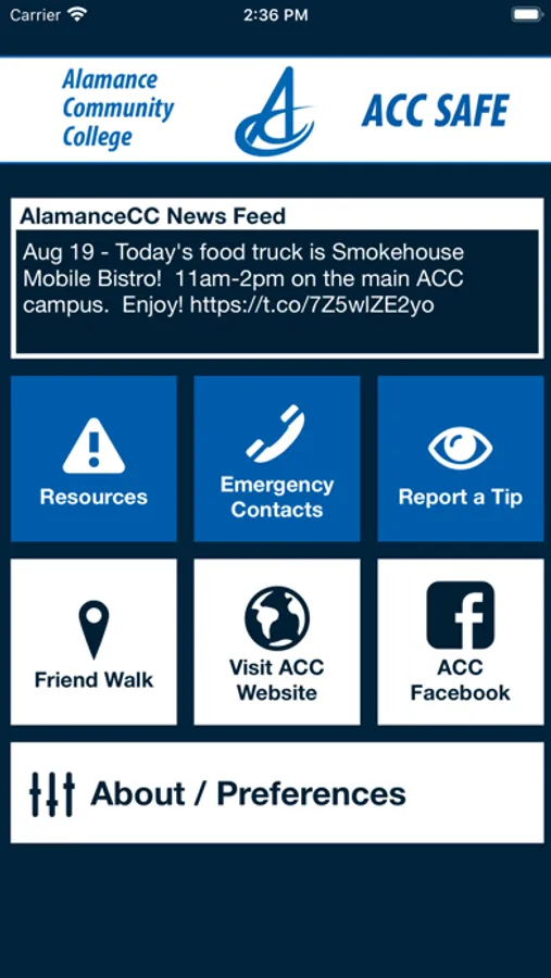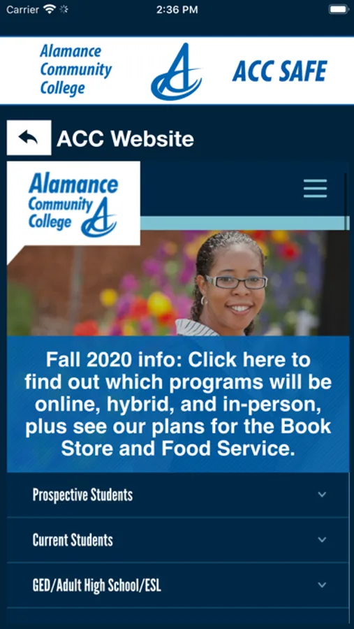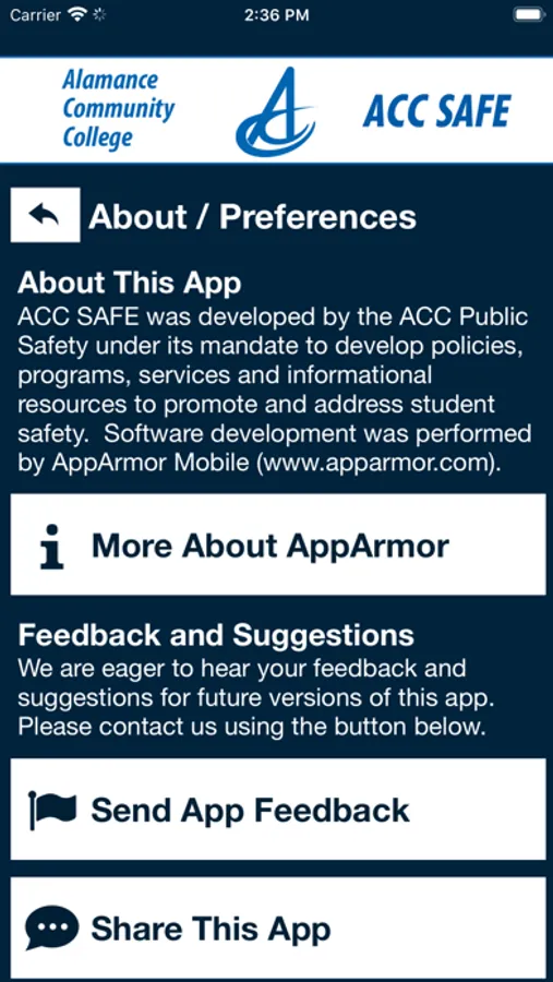 ACC SAFE is the official safety app of Alamance Community College. It is the only app that integrates with Alamance Community College's safety and security systems. Campus Security has worked to develop a unique app that provides students, faculty and staff with added safety on the Alamance Community College campus. The app will send you important safety alerts and provide instant access to campus safety resources.