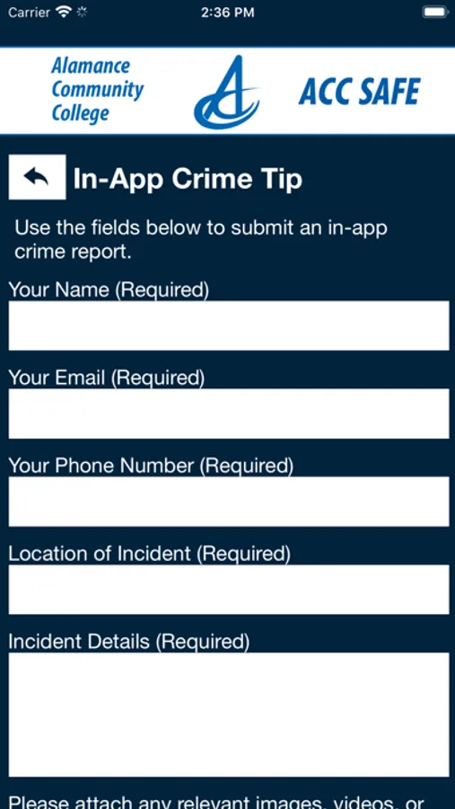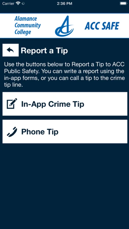 - Tip Reporting: Multiple ways to report a safety/security concern directly to Alamance Community College security.