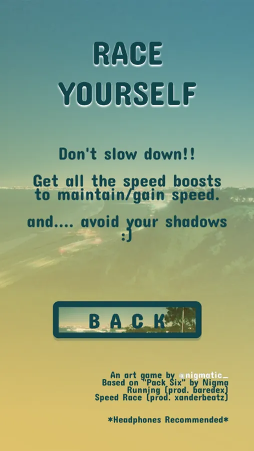 Just like life... you must keep running in circles, getting better and faster as time goes by. Keep your speed by collecting speed boosts and avoid your shadows selves to avoid a game over.