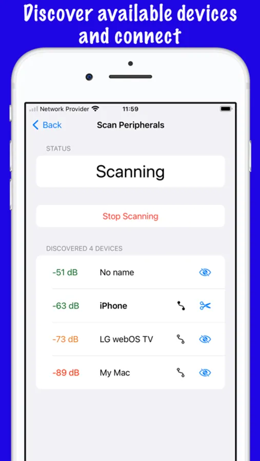 - Displays all peripherals, sorted by RSSI, with the ability to connect to devices that are open to connections