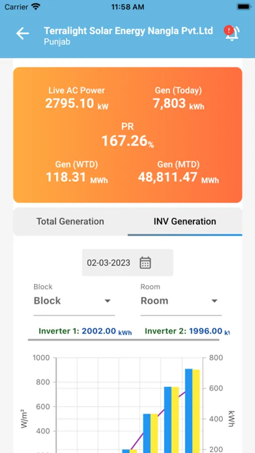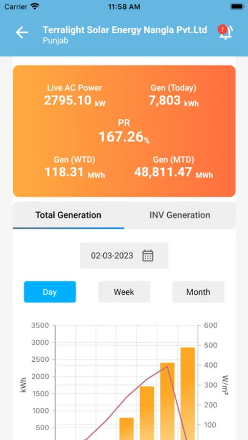 This app is designed to monitor the energy generated in any kind of Solar PV System like Roof Tops & Large Scale Utility Plants. Generation can be monitored on a daily / Weekly /Monthly basis. If multiple plants are assigned to a single login, one can choose the plant from the drop-down menu. For a solar PV generating system that has a weather station installed, Irradiance & temperature will be displayed along with generation data.