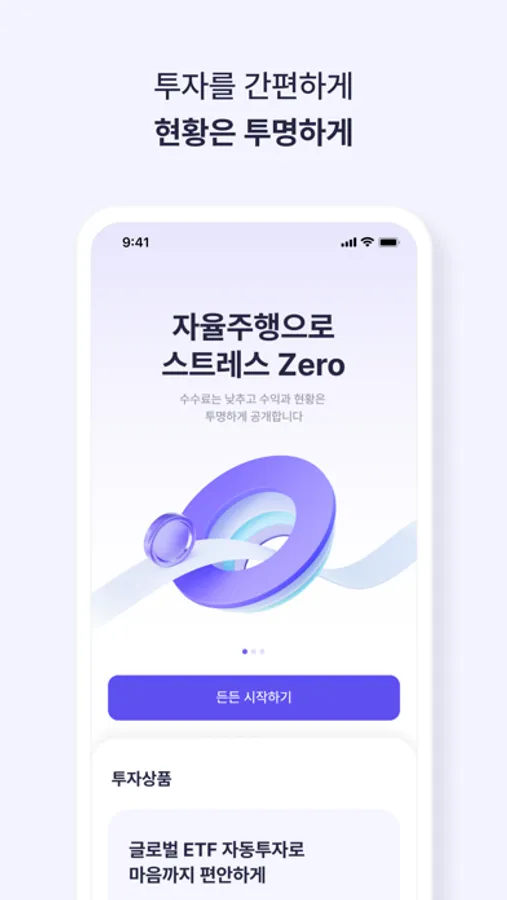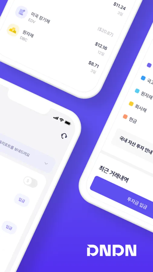 ‘든든(DNDN)’은 주식∙채권∙원자재 ETF, 달러 등 원화는 물론 다양한 글로벌 자산군의 분산투자가 당신의 손 안에서 자동으로 이루어지는 비대면 자산관리 글로벌 ETF 로보어드바이저입니다.
