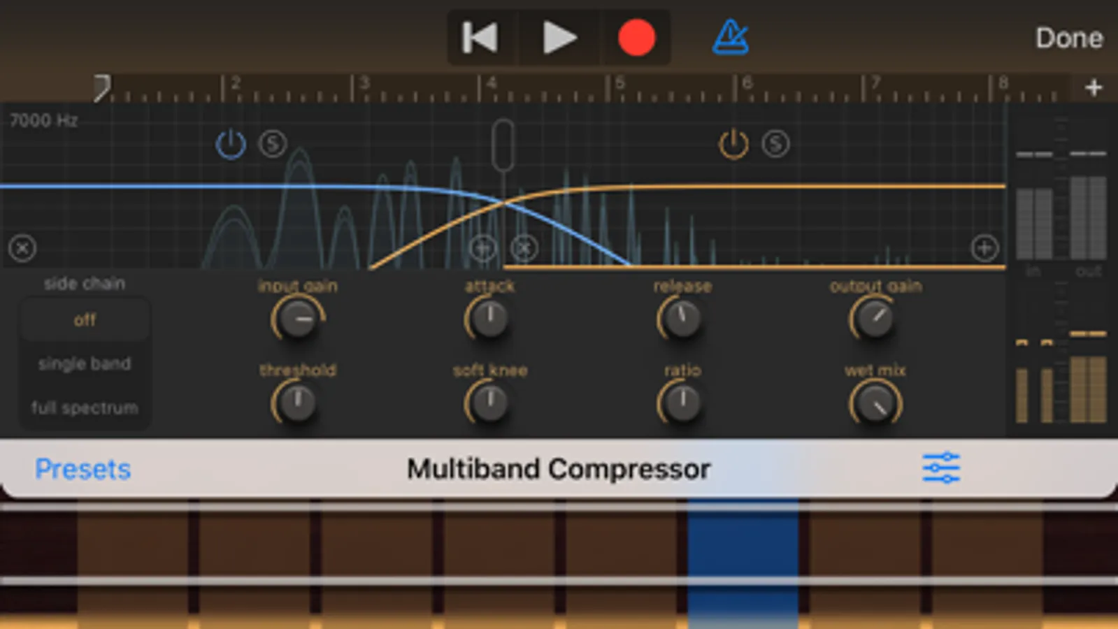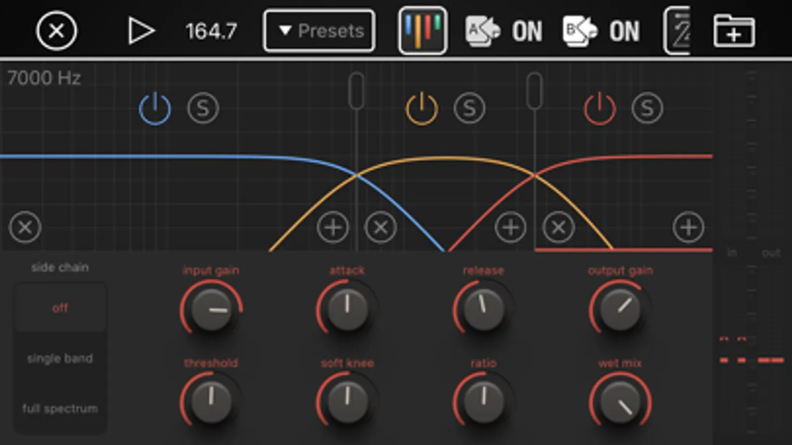 Each of up to four bands has eight compressor settings. They are input gain, output gain, attack time, release time, threshold, ratio, soft/hard knee, and wet mix.
