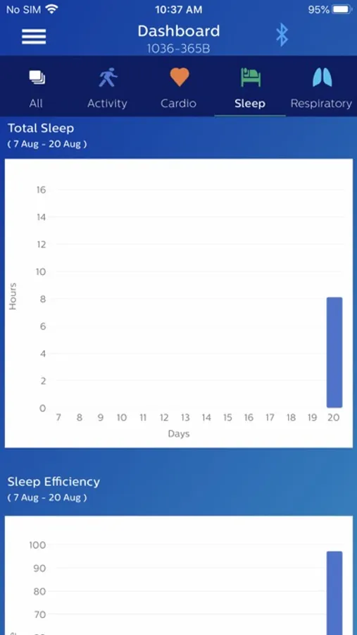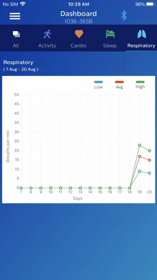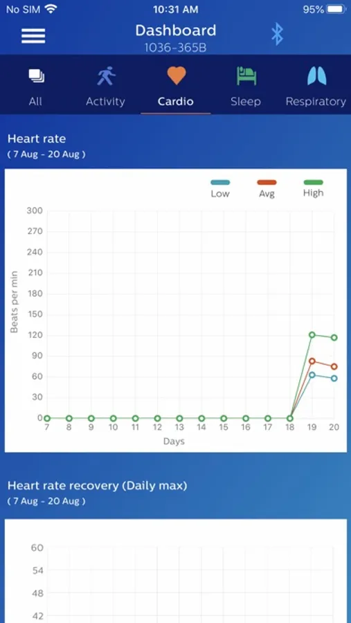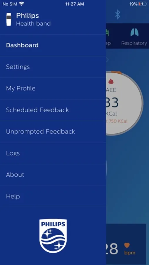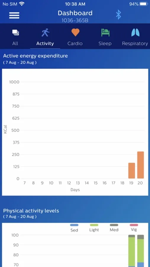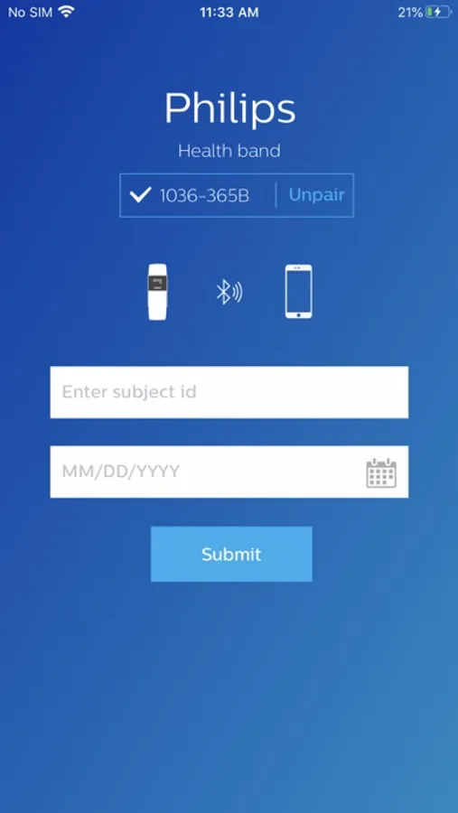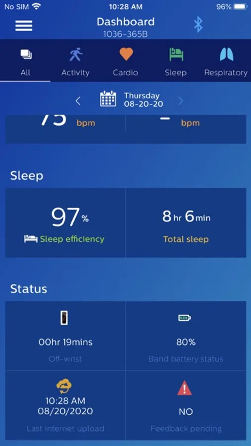 The Philips Health band (PHB) mobile application displays Bluetooth data acquisition from the PHB wrist-worn wearable medical device. Data includes energy expenditure, heart rate, respiratory rate, and sleep metrics. Patients wearing the device may provide feedback through the application’s patient reported outcomes (PRO) feature.