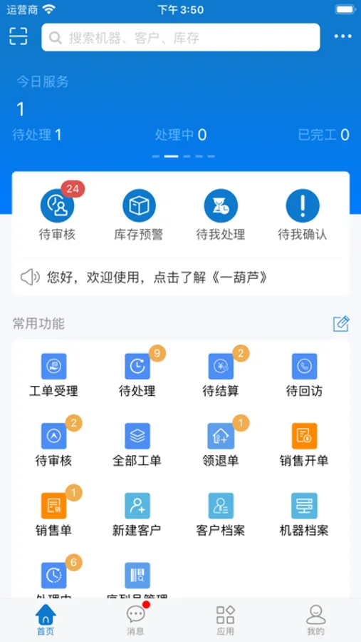 一葫芦APP是一葫芦服务管理系统的手机客户端,核心功能:客户关系,服务工单,租赁,进销存,往来账款,配送,分支网点,设备资产,考勤,办公OA等为一体,为服务型企业管理提供全面系统支撑平台
