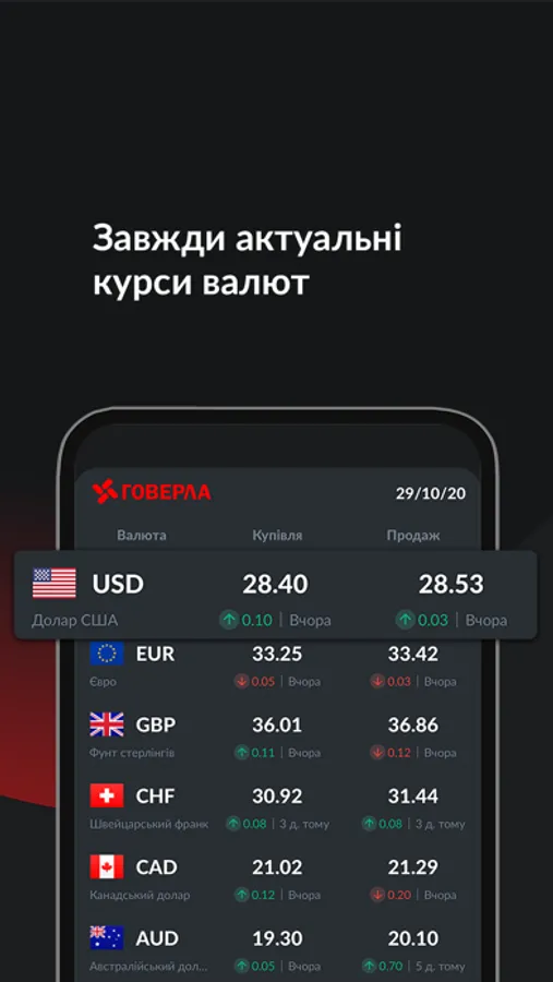 Найактуальніші курси обміну валют, тенденції та останні зміни по усіх валютах завжди під рукою у додатку від Говерла. Тепер не потрібно нічого оновлювати самостійно, додаток завжди відображає найновіші дані.