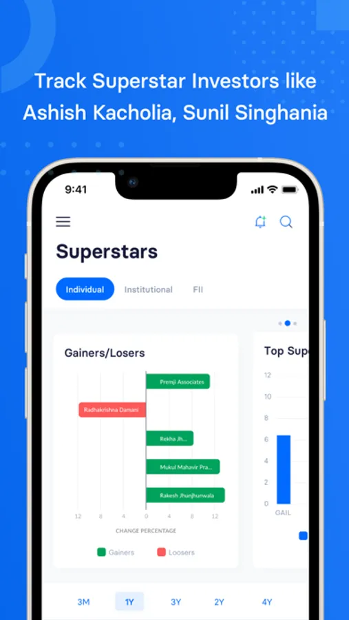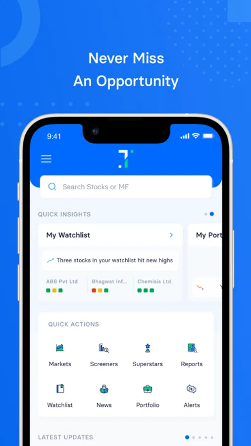 Keep track of price feeds, technicals, SMA/EMA, delivery and volume, insider trades, bulk block deals and more. Quickly find out all the major movements in the market. Add stocks to your watchlists and alerts to track them easily.