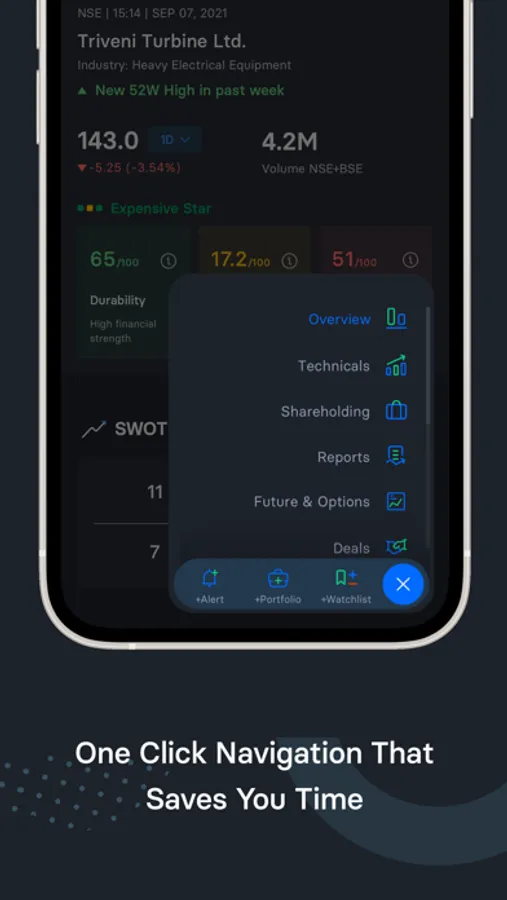 Trendlyne’s SWOT Engine gives you Strengths, Weakness, Opportunities and Threats for every stock, across its financials, technical, and management quality.