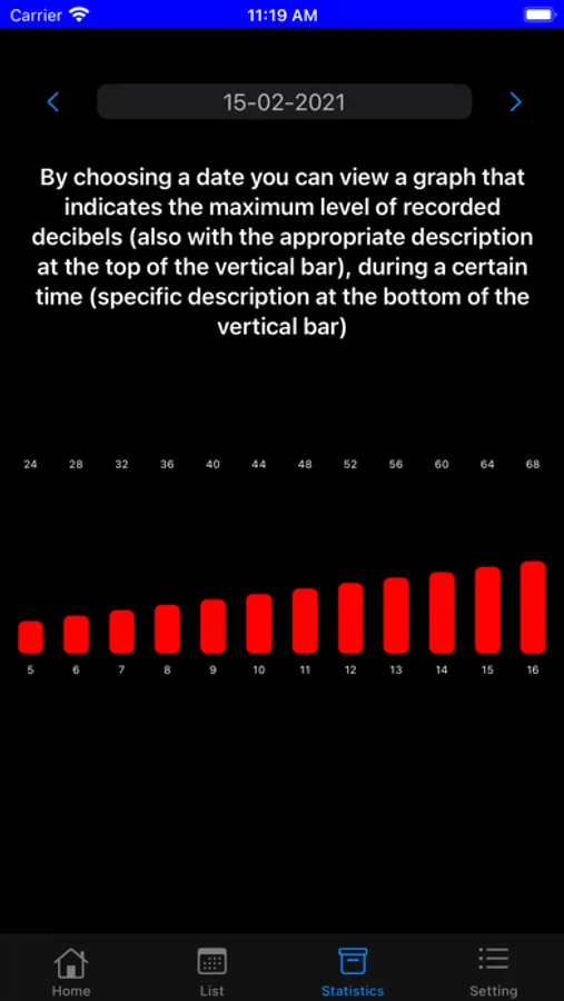 In the statistics menu, by choosing a date you can view a graph that indicates the maximum level of recorded decibels (also with the appropriate description at the top of the vertical bar), during a certain time (specific description at the bottom of the vertical bar)