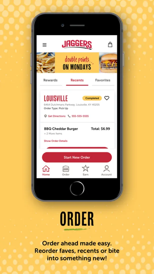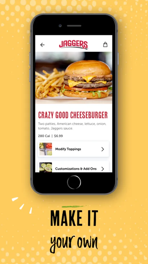 Find your closest Jaggers and order ahead for all your favorites like our Crazy Good Cheeseburger and customize your toppings. Add a Strawberry Shake or Shoestring Fries too! Choose drive-thru, carry-out or curbside pickup — whatever is most convenient for you. When you arrive, “Check In” so your order is made hot and fresh. For curbside pickup, enter your parking spot number and car details, and we’ll bring your order right to you. Join our Rewards program and earn points with every order. Collect points and redeem them for free Jaggers rewards.