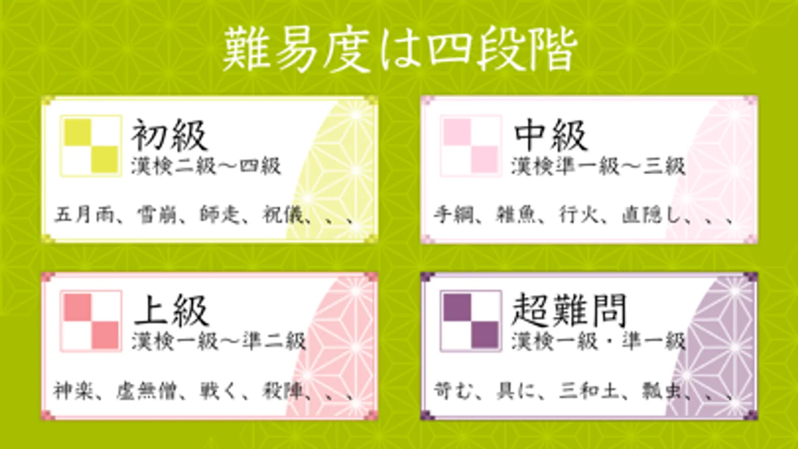 難易度は「初級」から「超難問」までの4段階。漢検レベルに合わせた出題になっているので、初心者から上級者まで、幅広く楽しめます。