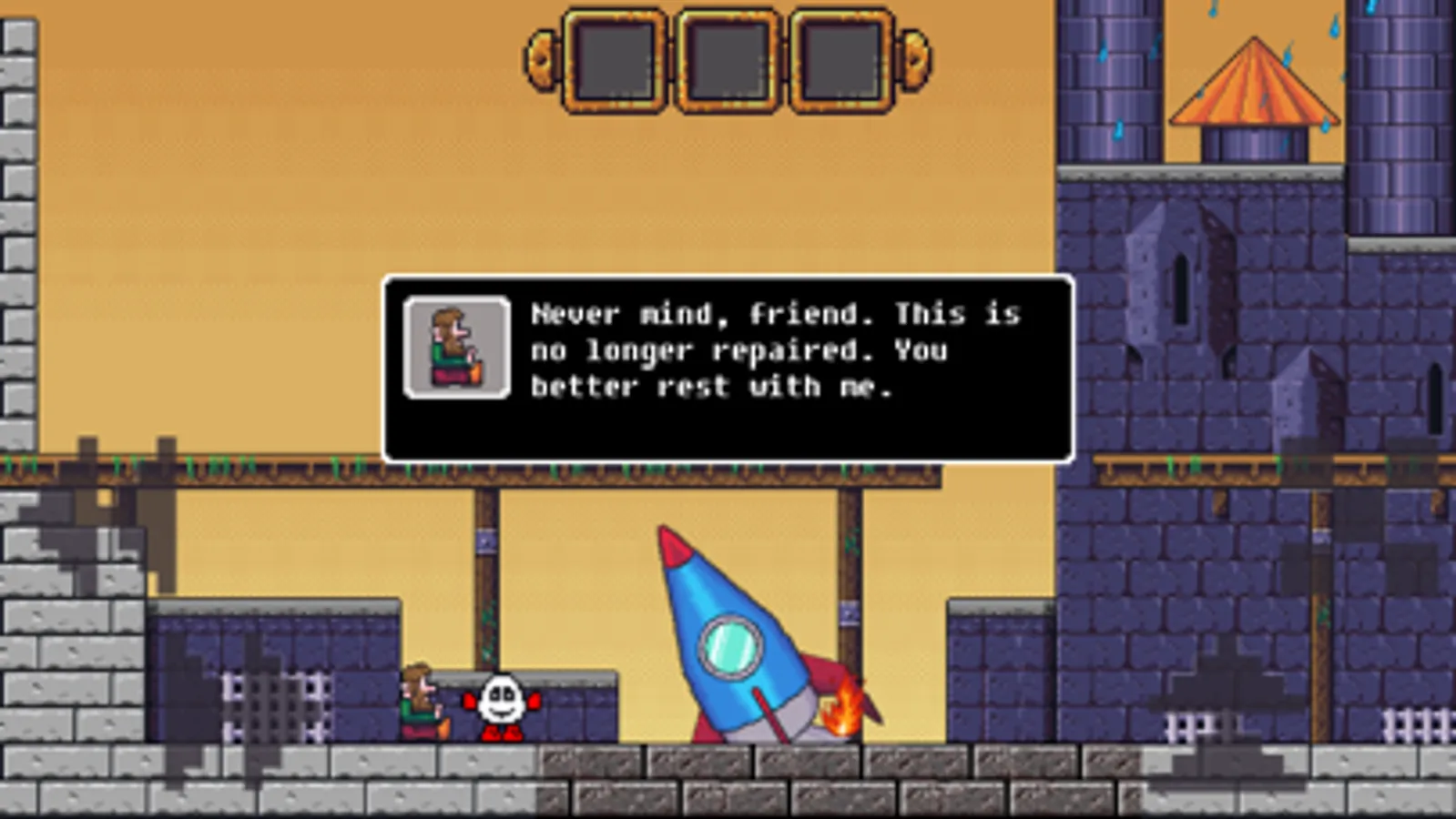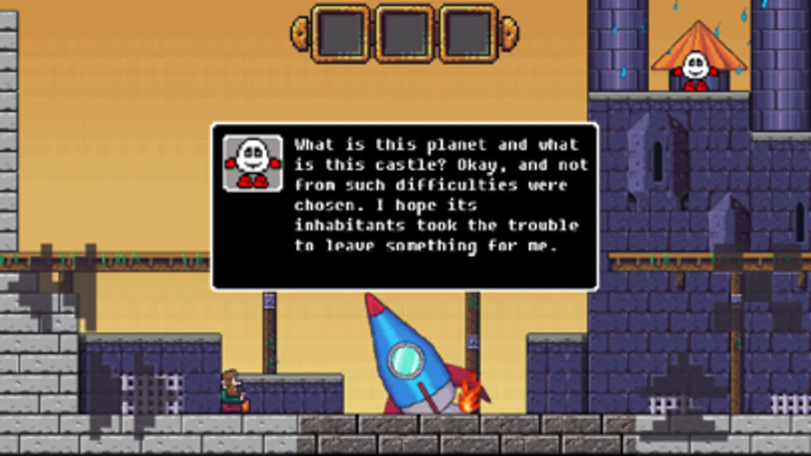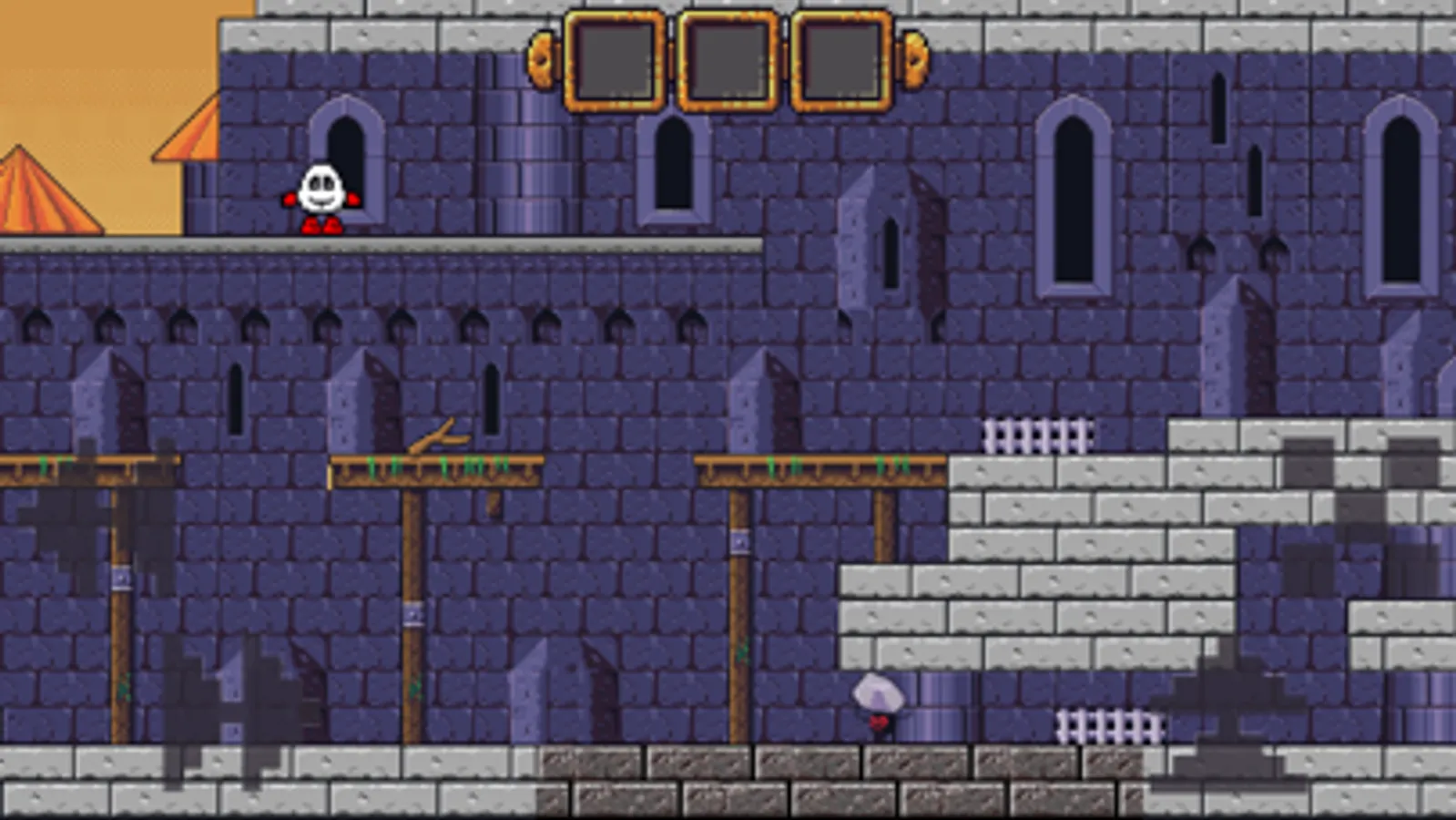 Maneuvering with difficulty after a collision with an asteroid, Dizzy found himself on an unknown planet. Our hero went out into the clearing. A lopsided rocket stood nearby. "And not from such difficulties got out" - thought Dizzy. "But by the way, the rocket should at least be leveled. And it wouldn't hurt to add fuel." With these thoughts, he looked around and saw some kind of castle. "Well, I hope its inhabitants took the trouble to leave something for me."