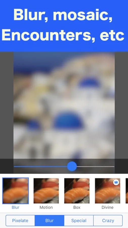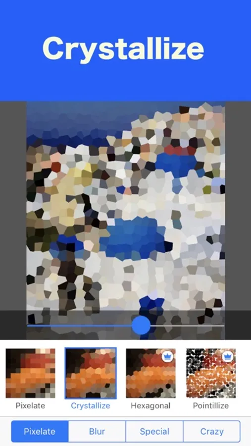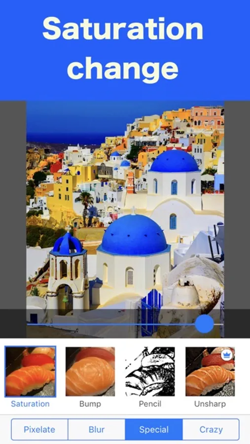 In addition to pixelate, you can process with various filters such as blur, saturation correction, encount, crystallize, etc.