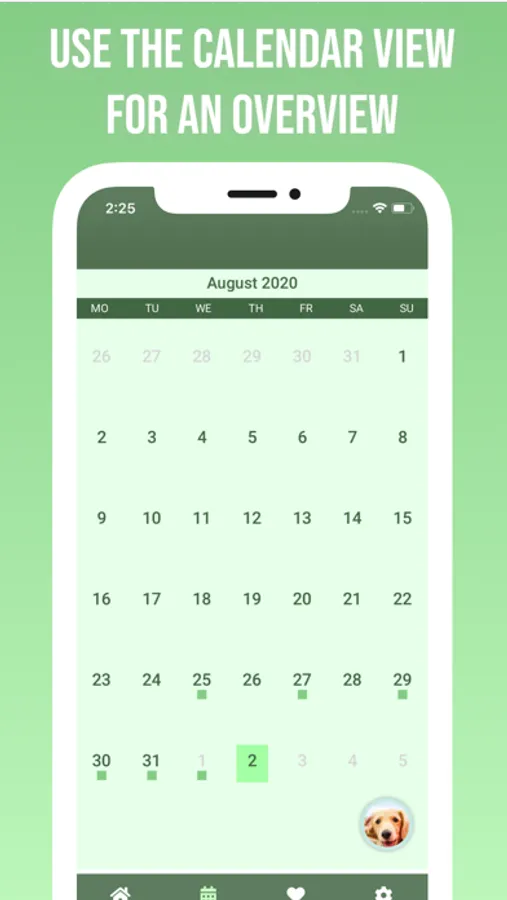 - Use the calendar view to see, for which days you created entries and create new entries for a specific day right away