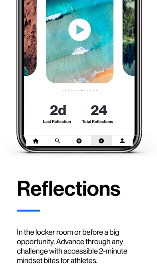 Practice with athlete specific Reflections that provide mental health and wellness for users at any time or place. Simply scroll to a topic to improve and listen to the 2 minute therapeutic bite. Win!