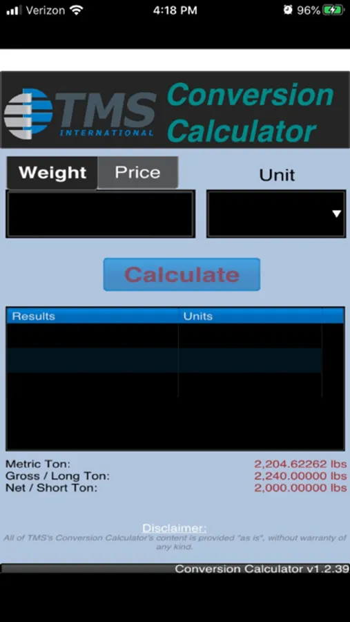 All contents of TMS's Conversion Calculator is provided "as is", without warranty of any kind.