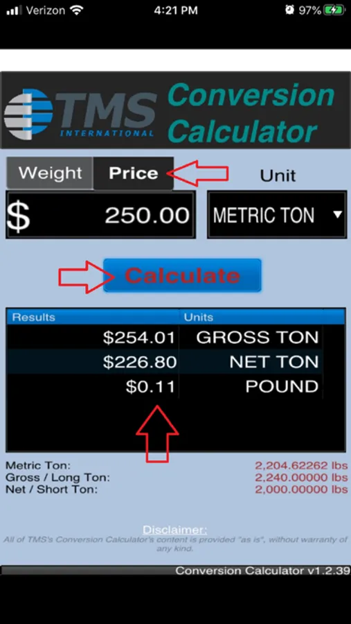 TMS International Weight Conversion Calculator to convert between Metric, Gross, and Net tons; and calculate price rate per weight; as well as other calculations.
