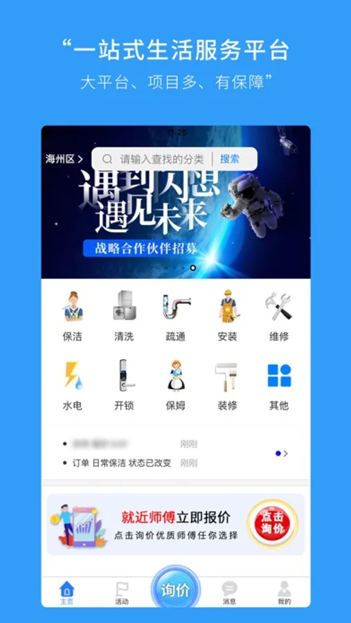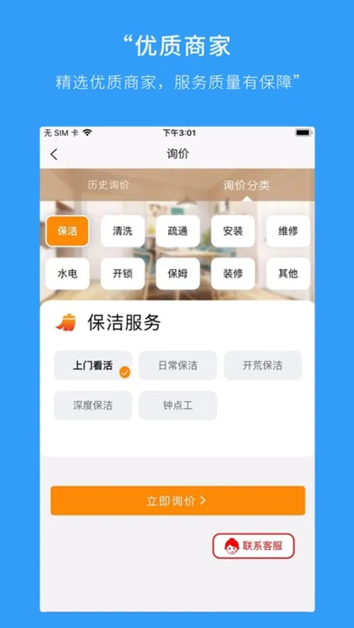 闪想是一款家政服务app, 提供保洁、安装、疏通、保姆、清洗、装修、打孔等服务;每天都有海量折扣服务等您来抢;活动商家覆盖各行各业。平台大量专业,快捷的各行业师傅实时在线抢单上门服务;网上预约方便:用户足不出户即可体验便捷的品质生活;服务到家:让用户享受更加‘省心、省时、省钱’的超值服务。