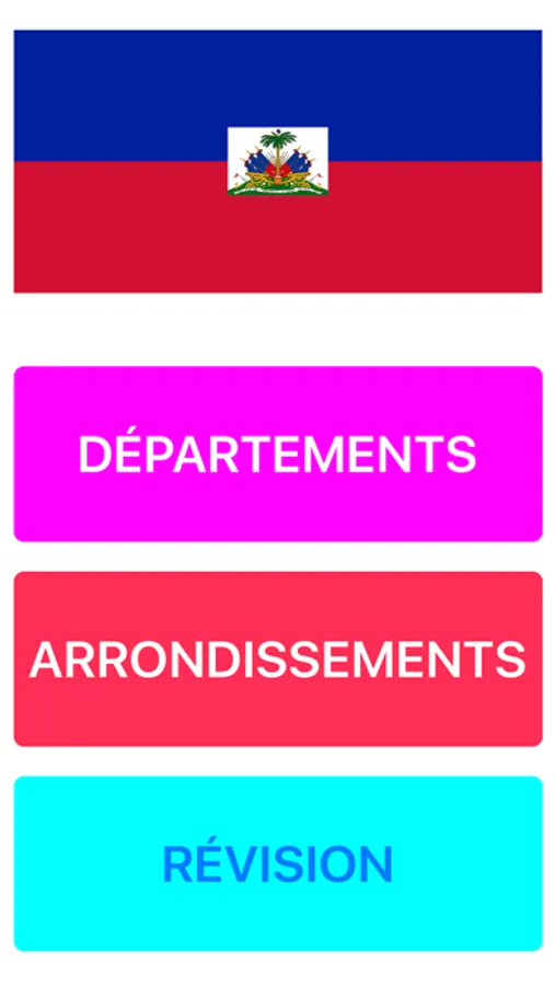 Yon dezyèm pati (DÉPARTEMENTS) ki se yon Quiz ki ba w posiblite teste konesans ou sou ki vil ki nan ki depatman.