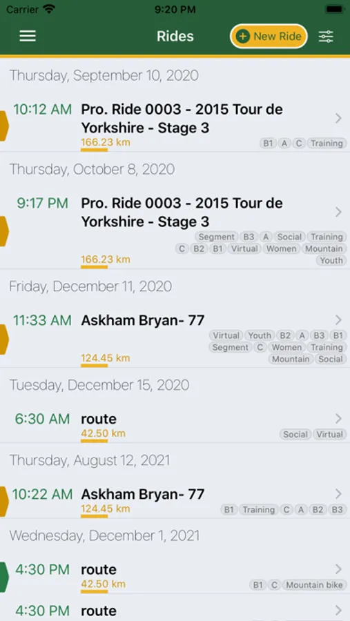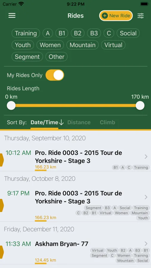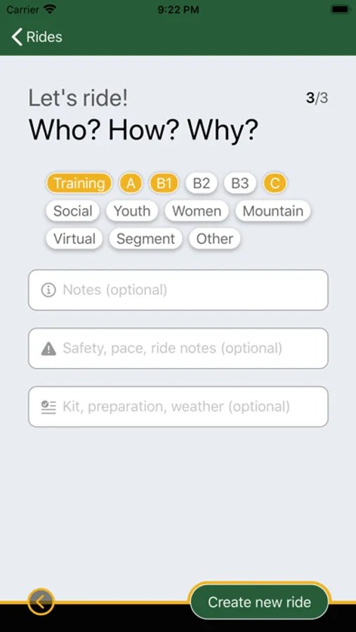 Rides also have a 'type' that makes it easy for members to find a ride that suits their ability. Road rides have categories that loosely match the speed of the group, from 'Training/A' rides though 'B' and 'C'. A ride can be in more than one category to bring in a larger group, or it can designate other characteristics of the ride, such as one for 'Women' or 'Youth'.