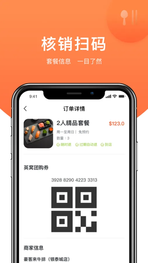 2、手机验券:在手机上输入验证码或者扫描二维码即可完成团购券核销,方便查看验证历史。