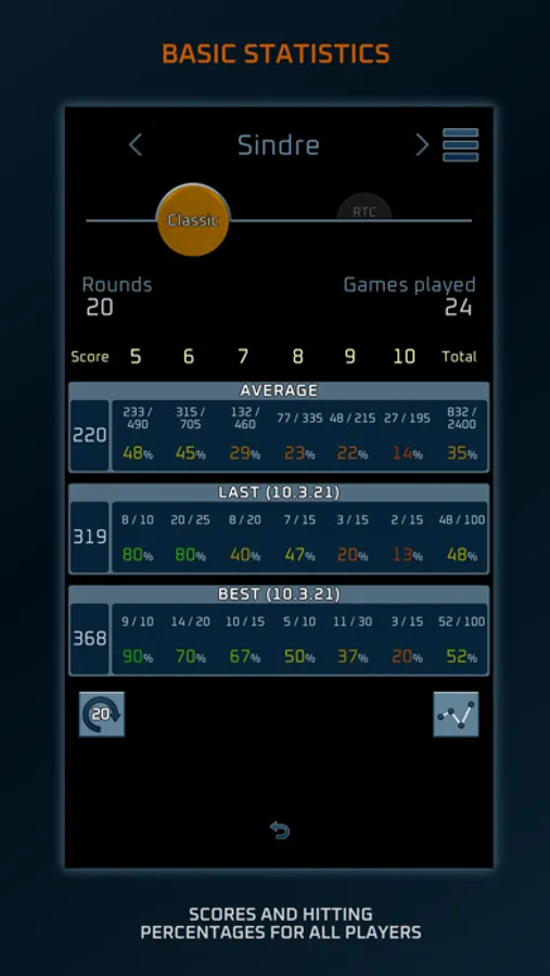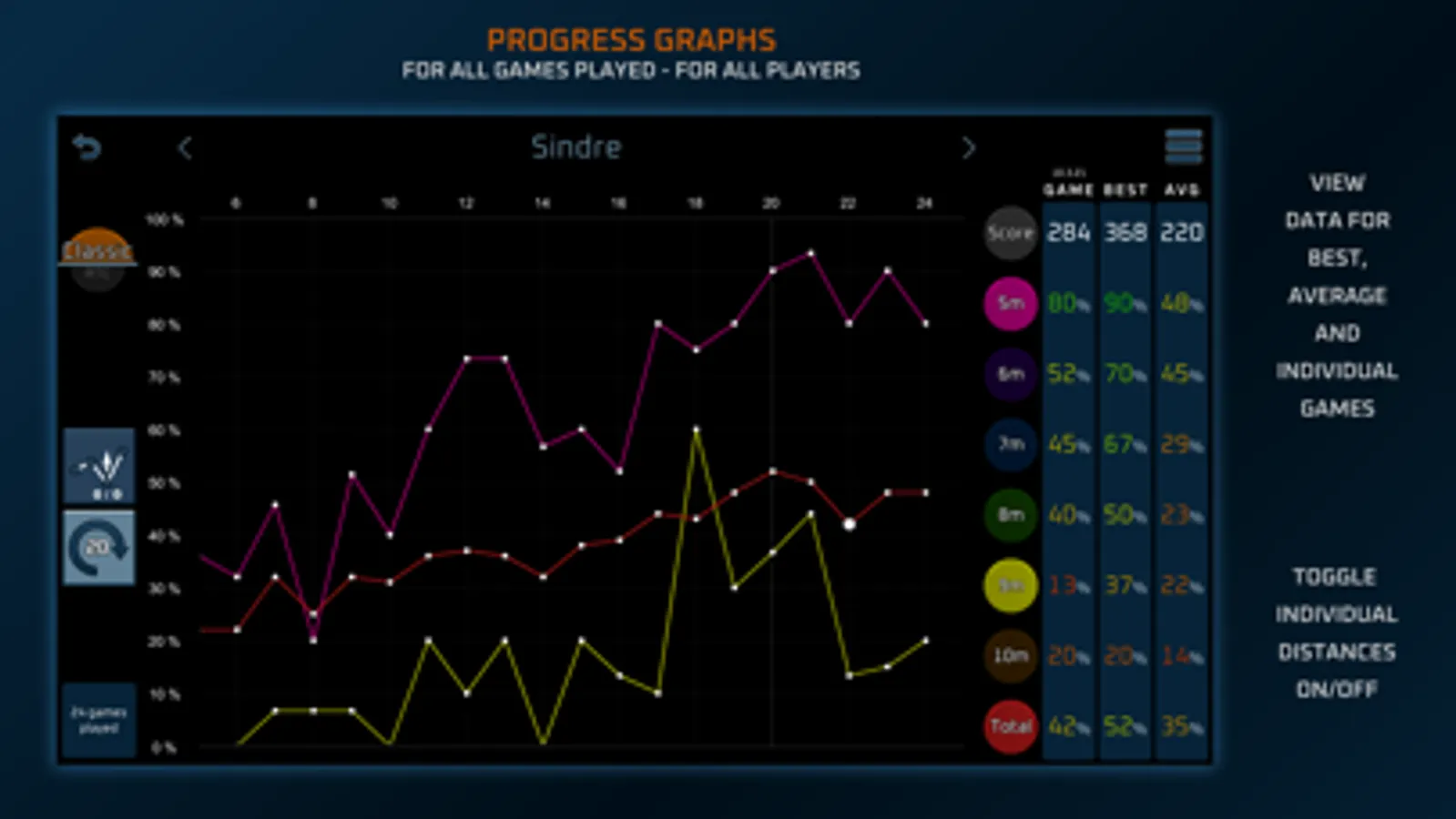 - view progress graphs of scores and hitting percentages for individual distances for all players