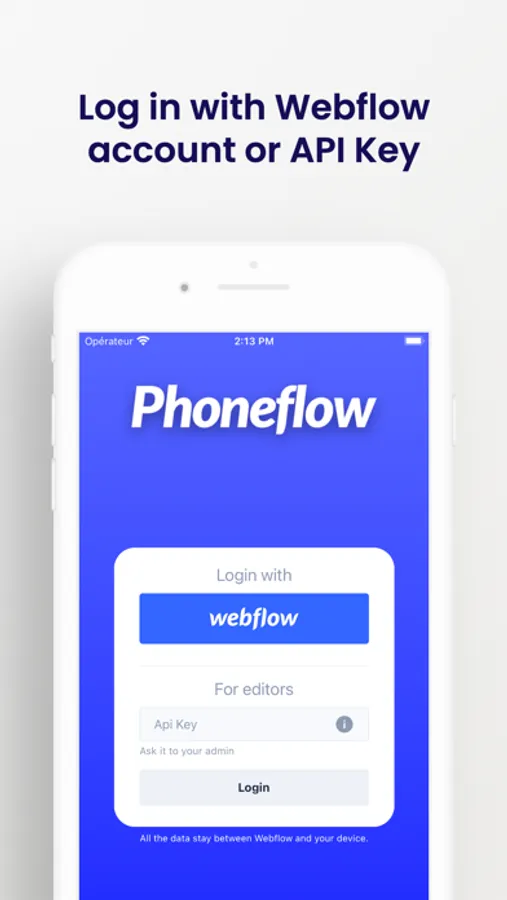 Phoneflow is not an official Webflow app. It's a mobile client for Webflow API. Phoneflow communicates only with Webflow through their API and your Webflow data will never be stored elsewhere.