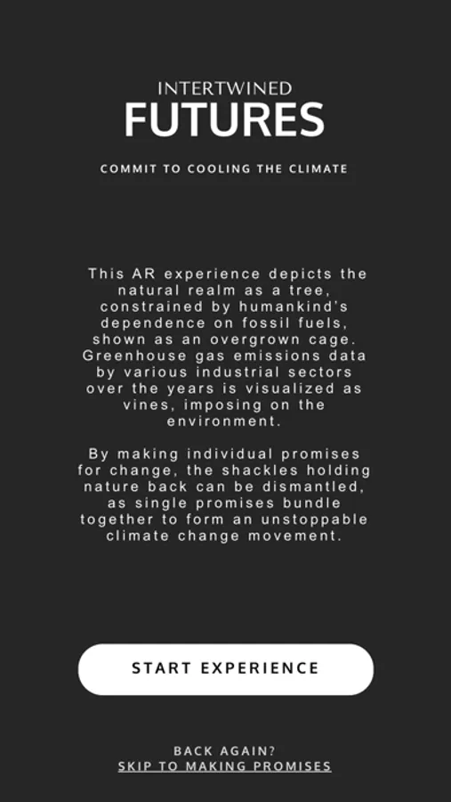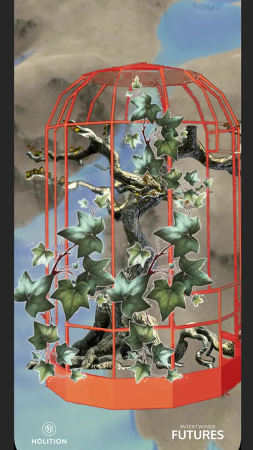 This AR experience demonstrates how fossil fuel emissions limit nature’s ability to thrive, by depicting the natural realm as a tree, constrained by human’s dependence on fossil fuels, shown as an overgrown cage. Greenhouse gas emissions data by various industrial sectors over the years is visualized as vines, imposing on the environment.