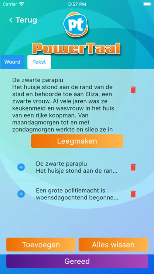 Binnen uw eigen dashboard en trainingsomgeving hebt u ongelimiteerd toegang tot alles wat Powertaal te bieden heeft. Een uitgebreidere set van woorden én zinnen met meer trainingsopties. U kunt bijvoorbeeld oefenen met woorden + de bijbehorende lidwoorden en u kunt een dictee maken. Elke maand er nieuwe woorden en zinnen om mee te oefenen.
