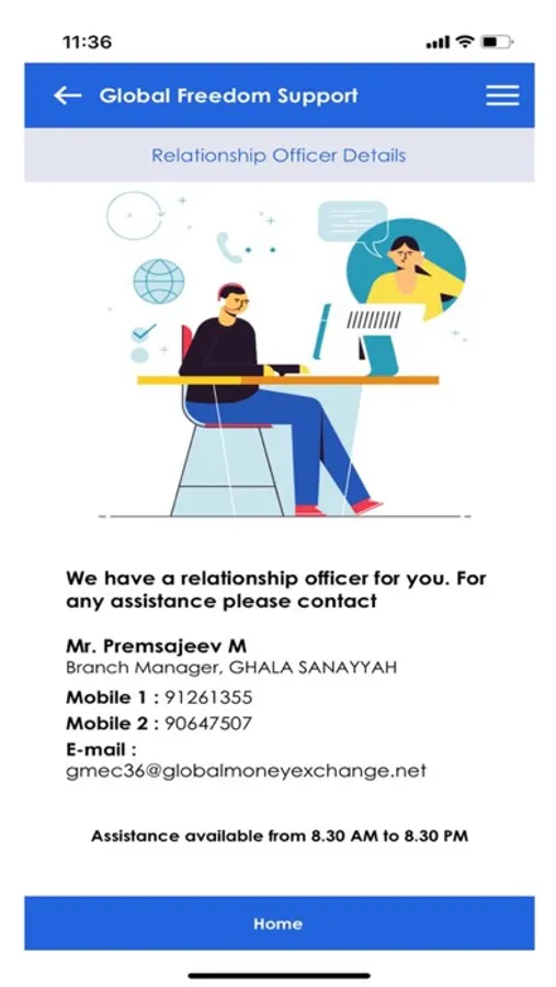 You can pre-book your foreign currency exchange requirements through our app and we provide dedicated support by means of a relationship officer whose details can be viewed in the App and dedicated support which will be available from 8.30 AM to 10.30 PM in WhatsApp/Call - 00968-99220965 / email: freedom@globalmoneyexchange.net.