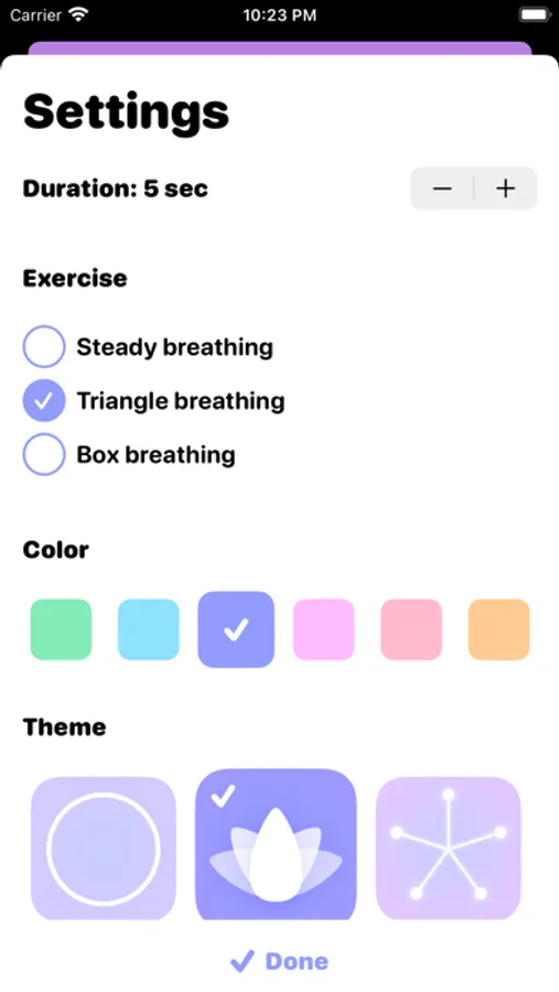 Customize your experience with different themes and colors. Change the breath duration and choose from 3 different exercises: